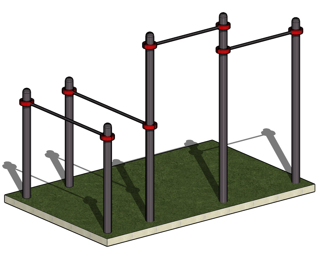 К опорным столбам высотой 2600мм, 2300мм в крепится с помощью хомутов на высоте от уровня основания: 2550 мм, 2400 мм перекладины турника шириной 1200 мм, брусья фиксируются на высоте 1400-1500 мм от уровня основания.