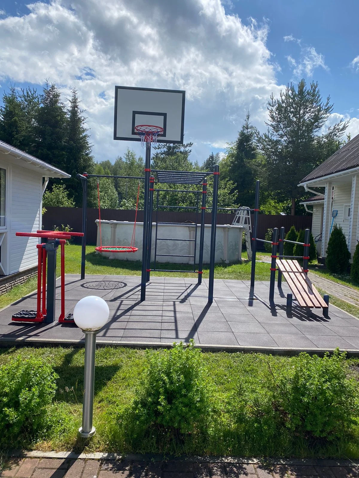 Рукоход, шведская стенка, турник ,брусья, скамья для пресса и баскетбольный щит. Добавление качелей в спортивный комплекс - это отличный способ сделать его более привлекательным и функциональным.